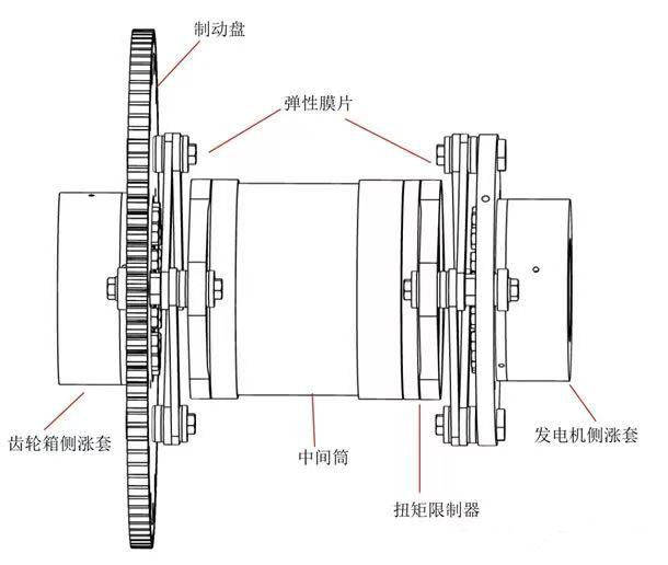 The diaphragm coupling of the wind turbine is generally composed of an expansion sleeve, an elastic diaphragm, an intermediate cylinder and a torque limiter.